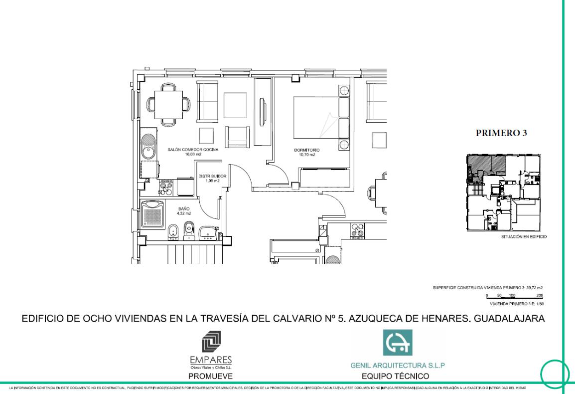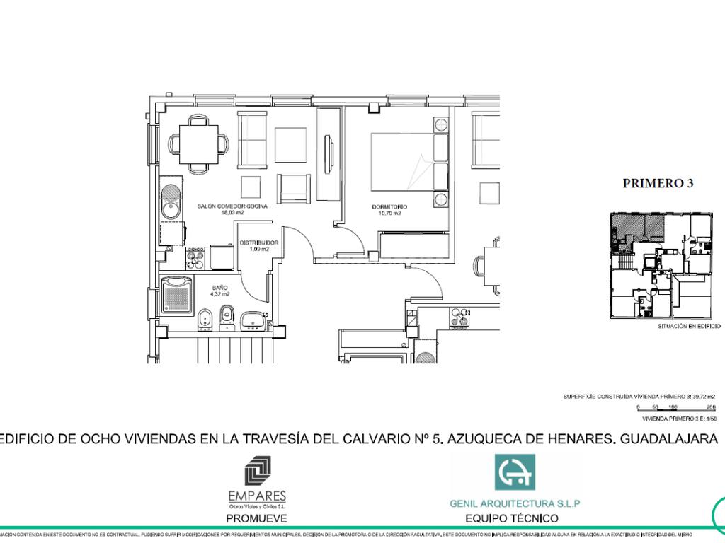 'TECNOCASA AGENCIA INMOBILIARIA DE AZUQUECA DE HENARES, ZONA ESTACIÓN, VENDE PISO DE OBRA NUEVA SOBRE PLANO compuesto por 1 dormitorio, baño completo con ducha y ventana, y salón muy luminoso debido a sus grandes ventanales con cocina americana, a 10 minutos del Ayuntamiento y Centro de especialidades, y rodeado de todo tipo de comercios y servicios con una superficie total de 46 m2 construidos.